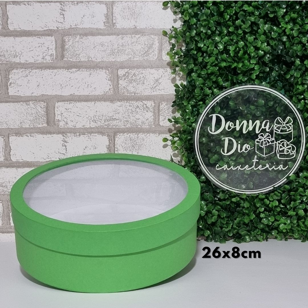 Caixa em papelão rígido medindo 26cm de diâmetro e 8cm de altura, tampa com visor em acetato, revestida internamente com papel branco off-set e externamente com papel color plus.